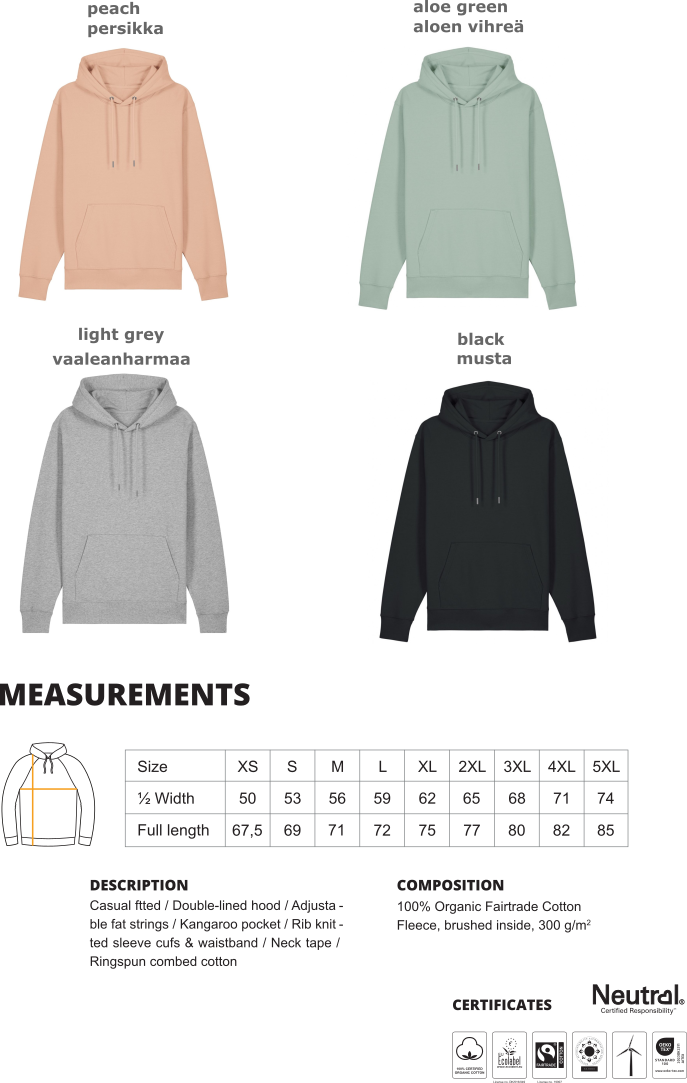 Huppari on unisex malli. Sen materiaali on laadukasta, 100% reilunkaupan luomupuuvillaa.